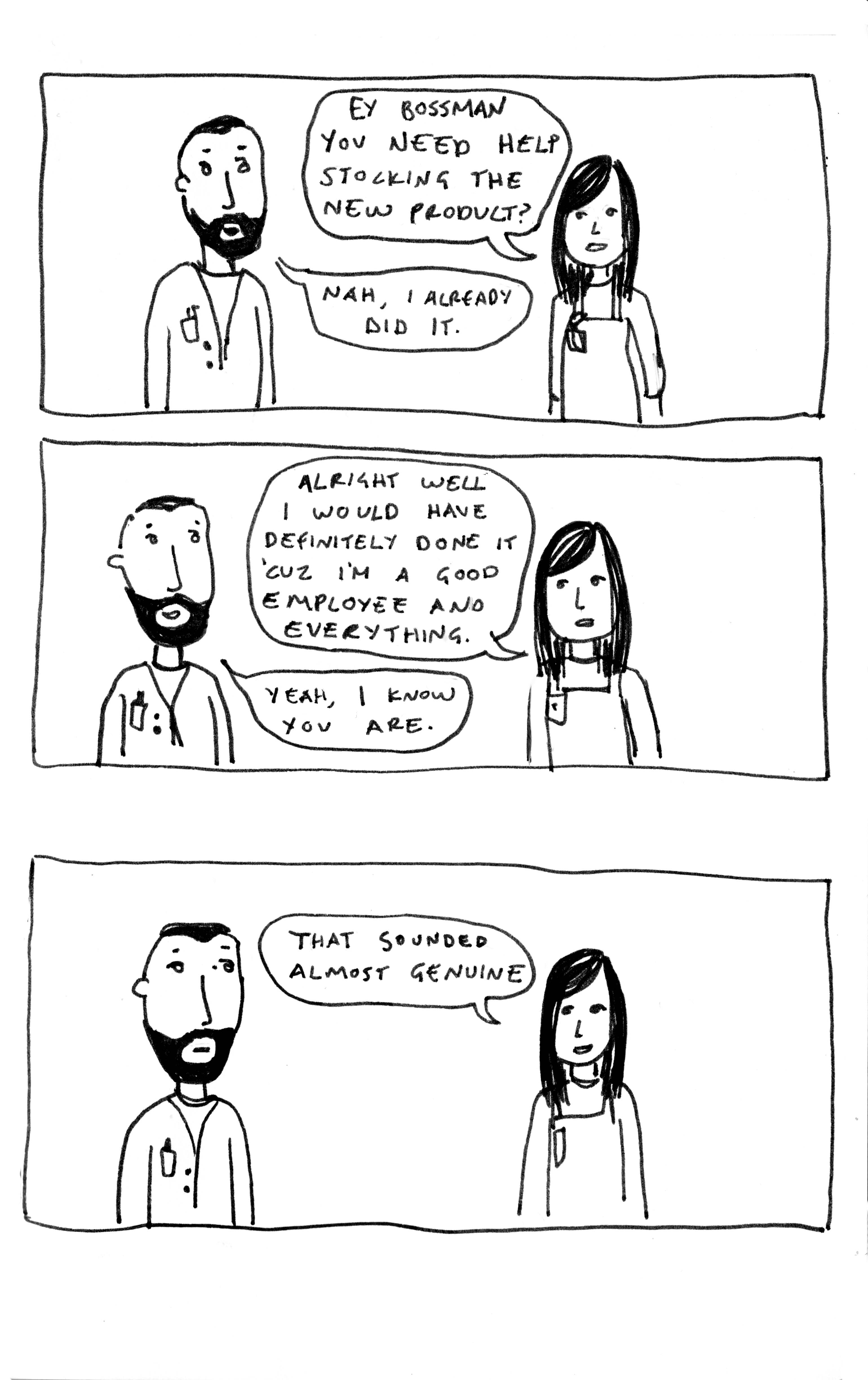 Tagged #workinginatoystore, after lunch, boss, bossy, comics, comix, customer service, leah dubuc, life comics, lunch, work, working in a toystore